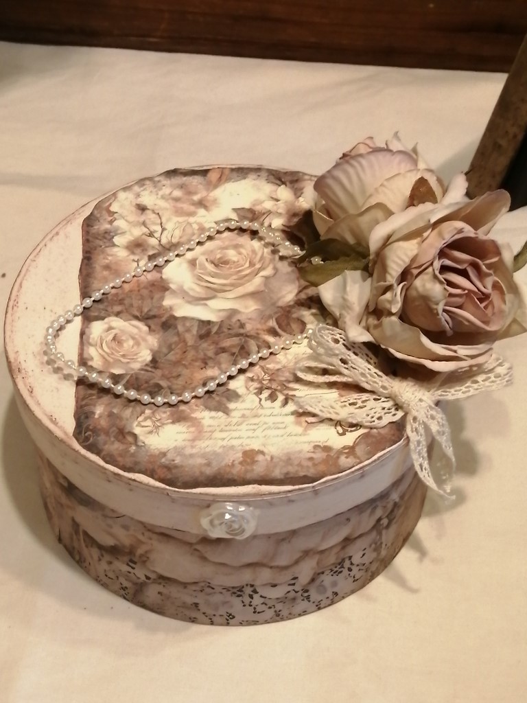 De très belles affiches de roses et de dentelle frou frou, un petit noeud en dentelle de coton écrue, deux magnifiques roses vieillies, une chaînette de perles ivoires et un petit médaillon ivoire, finissent la déco.
