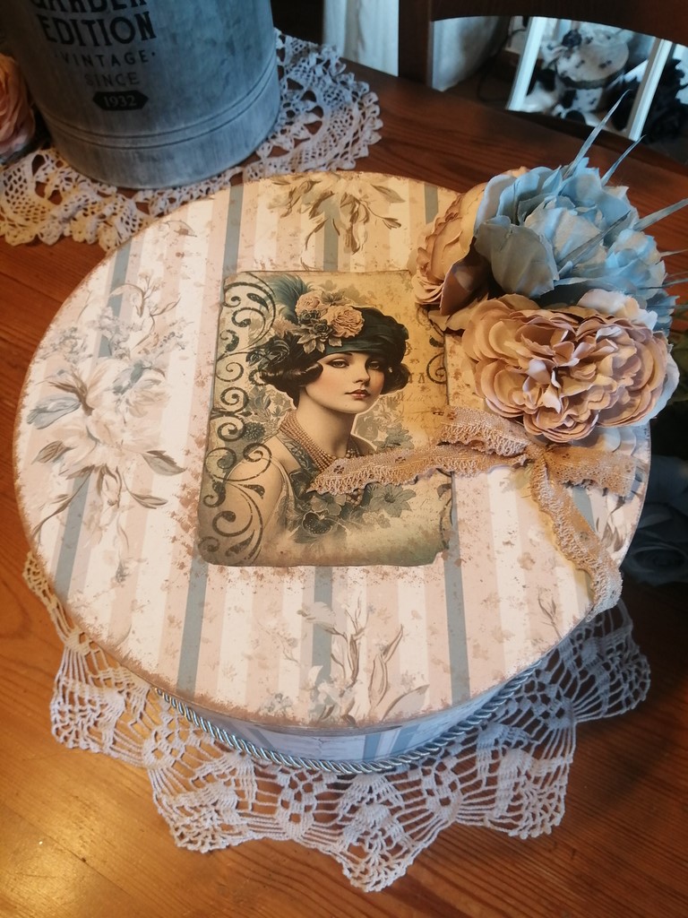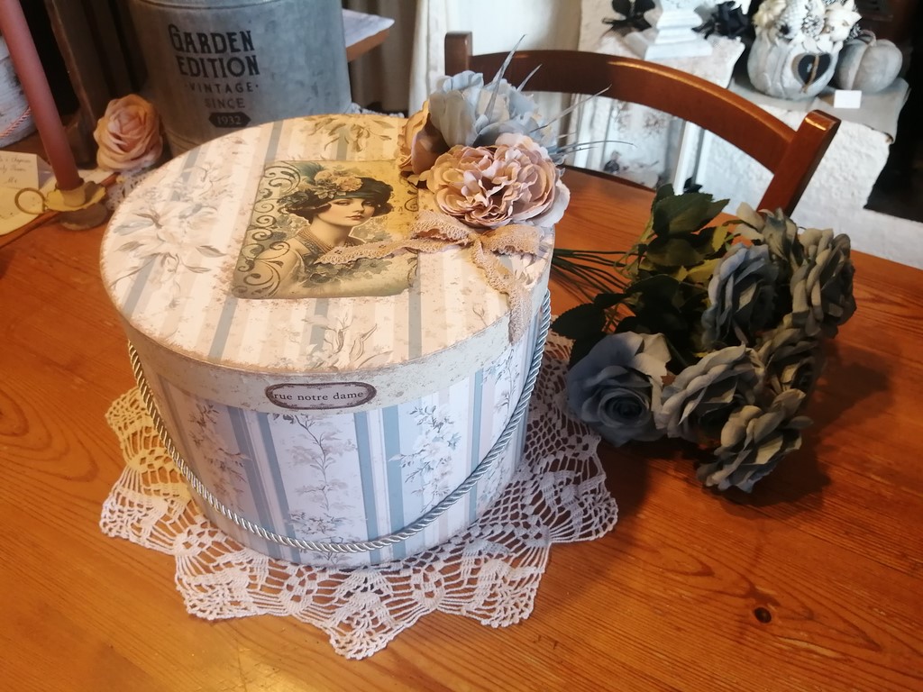 De la peinture biscuit pastel et une patine taupe accentue son aspect vieilli, des boites à chapeaux de nos grands-mères.