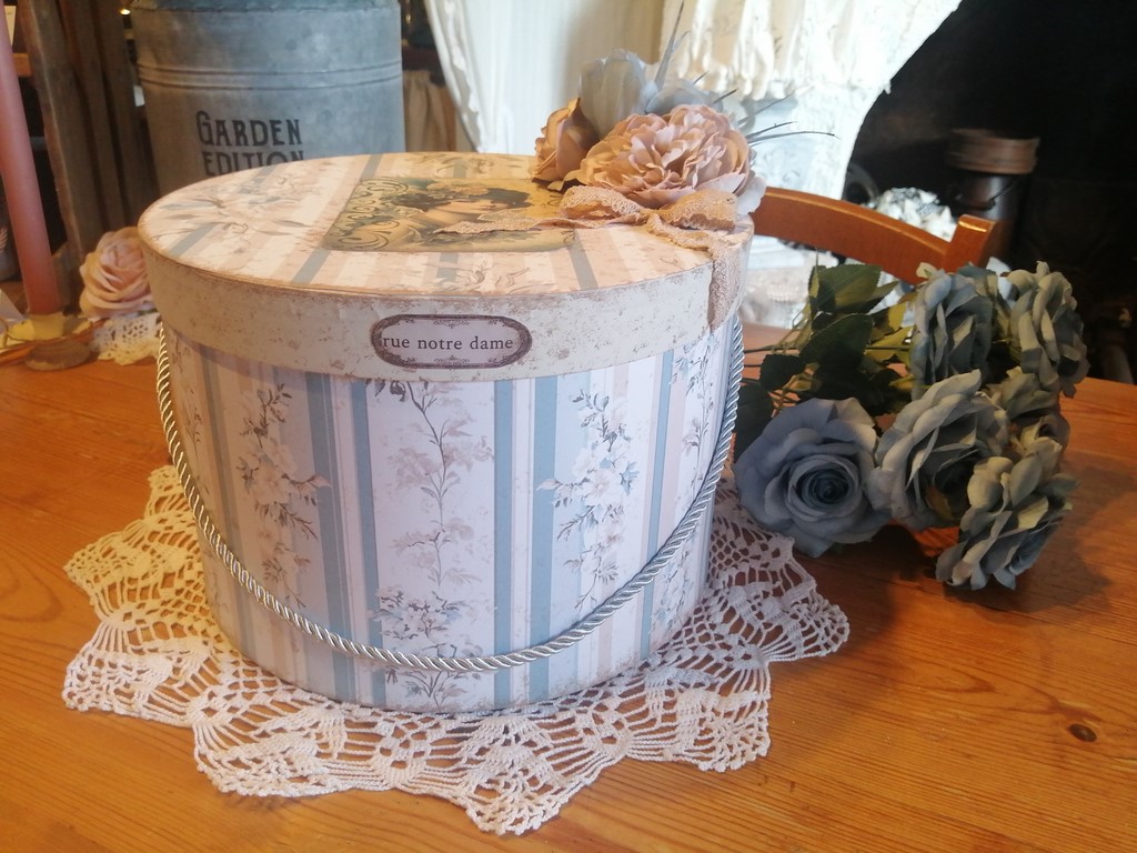Cette boite à chapeaux très vintage, est en carton recyclé, avec de très belles impressions dans le style toile de Jouy.