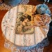Un cordon 3 brins torsadés de couleur bleu pâle, une étiquette "Rue Notre Dame", un magnifique noeud en dentelle beige rosé, deux pivoines beige rosé et une pivoine bleu pastel, finissent la déco.