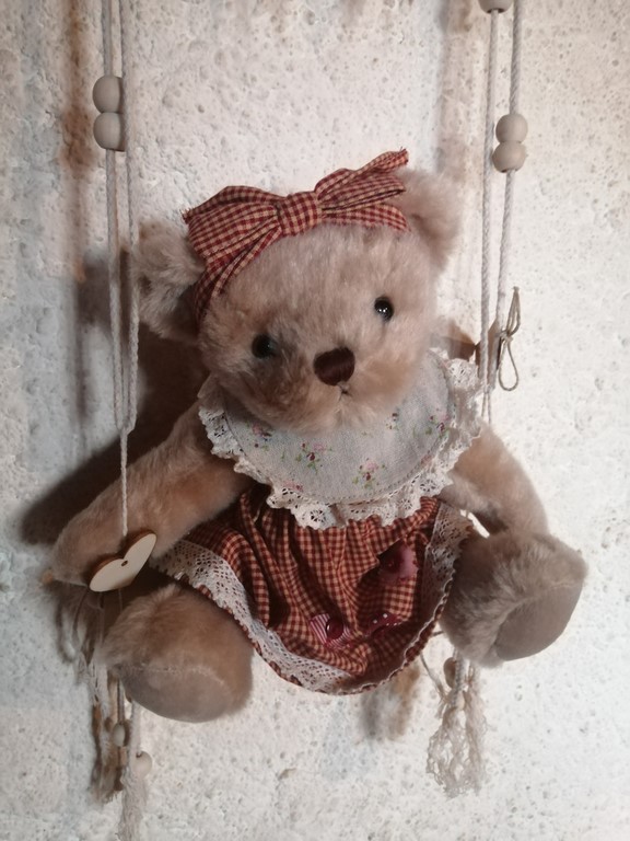 est composée, d'une magnifique oursonne "Bella", habillée d'une robe en coton, vichy rouge grenat, s'amusant sur une balançoire fait de coton à macramé, ornée de perles en bois, de coeurs en bois, de rubans de coton beige et de fleurs petites fleurs rouge/grenat.