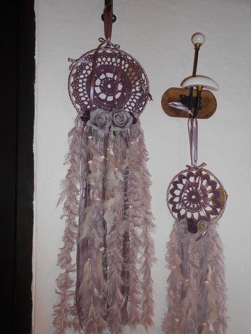 Quatre boutons de roses light purple et grenat foncé, finissent cet attrape-rêves très shabby chic.