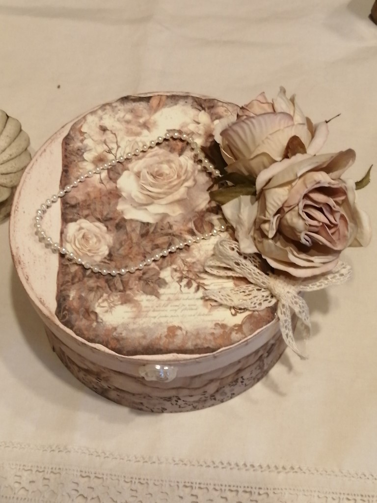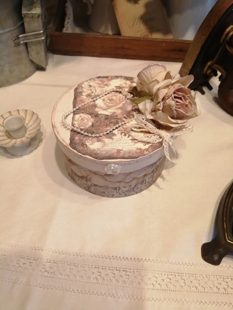 De très belles affiches de roses et de dentelle frou frou, un petit noeud en dentelle de coton écrue, deux magnifiques roses vieillies, une chaînette de perles ivoires et un petit médaillon ivoire, finissent la déco.