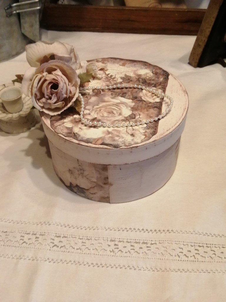 Très romantique cette boite à bijoux est recouverte d'une peinture biscuit pastel puis d'une patine taupe, pour son aspect vieilli.