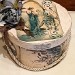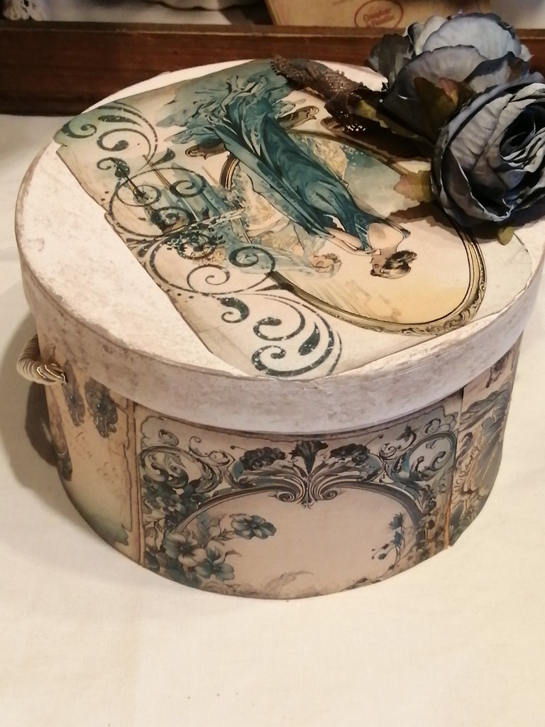 Cette très romantique boite à chapeaux est en carton recyclé, avec de très belles impressions Vintage dans les tons bleus gris, et a pour dimensions, 16 cm de diamètre et 9.50 cm de hauteur.