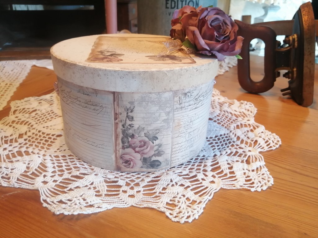 Cette très romantique boite à chapeaux est en carton recyclé, avec de très belles impressions Vintage dans les tons rose shabby, et a pour dimensions, 19 cm de diamètre et 11 cm de hauteur.