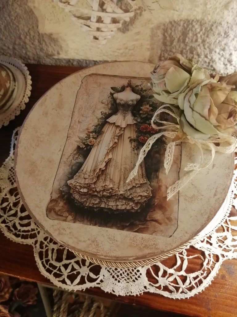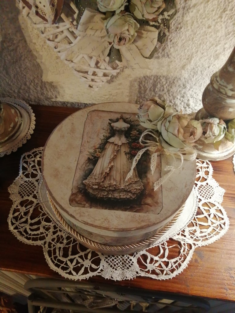 Cette très romantique boite à chapeaux est en carton recyclé, habillée de gravures Victorienne, et a pour dimensions, 19 cm de diamètre et 11 cm de hauteur.