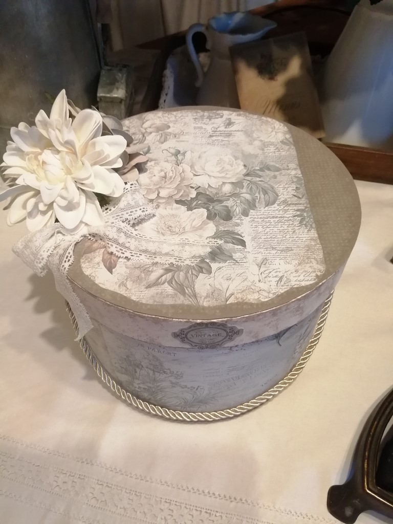 De la peinture blanche et une patine gris souris lui confèrent son aspect Vintage, des boites à chapeaux de nos grands-mères.