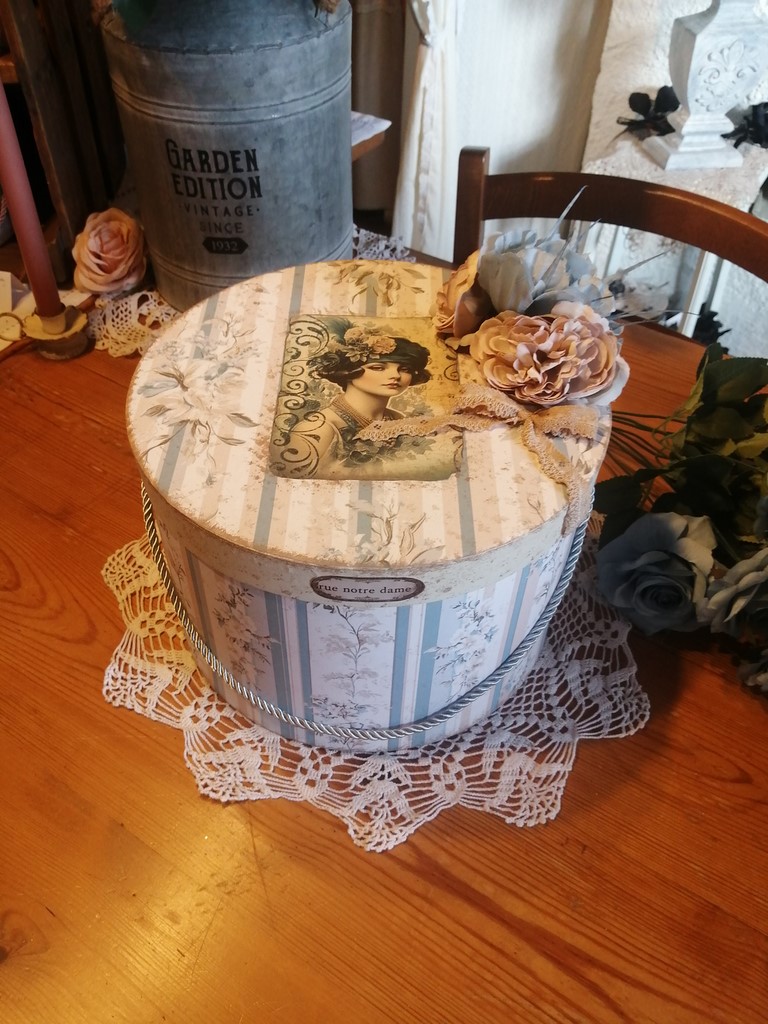 De la peinture biscuit pastel et une patine taupe accentue son aspect vieilli, des boites à chapeaux de nos grands-mères.