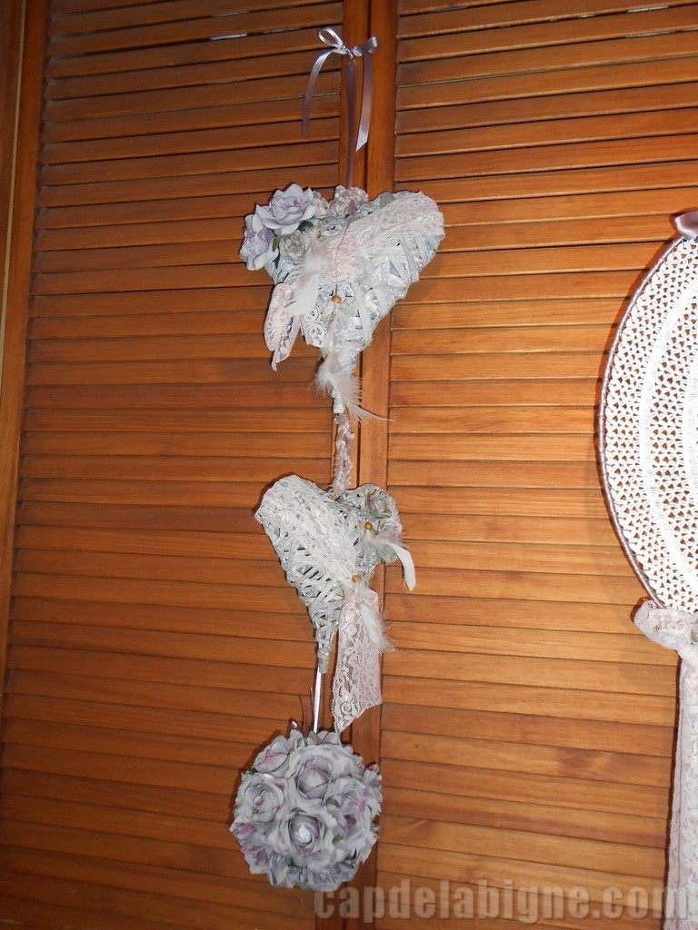 1 cœur osier gris de dimension 21x26cm, orné de roses shabby, d'une magnifique dentelle rose chair