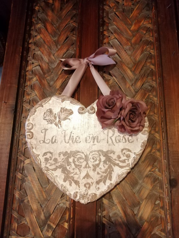 Cet élégant Coeur Baroque, de la Collection "La Vie en Rose", est en bois blanc patiné de taupe rosé, agrémenté de magnifiques moulures en argile patinées, de belles impressions faites au pochoir, ainsi que deux roses en argile patinées.
