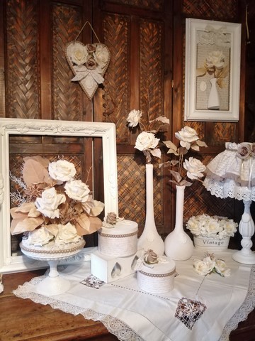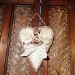 Au centre du coeur, deux magnifiques roses blanc cassé, deux belles roses taupes, et un noeud en tissu "Nostalie", viennent ornées la suspension.