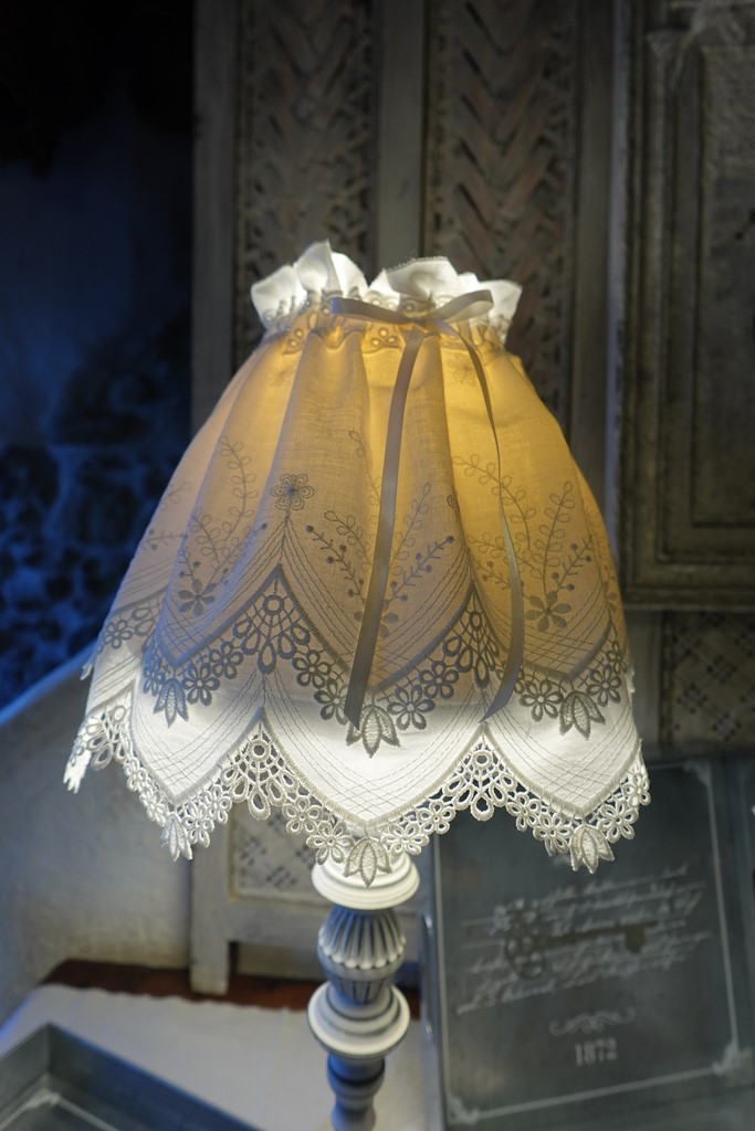 Son jupon d'abat-jour est en coton brodé blanc, double volants aux festons pampilles à pointes, d'une hauteur de 25 cm. De la dentelle de broderie anglaise est utilisé pour le lien de serrage, en ruban de satin blanc.