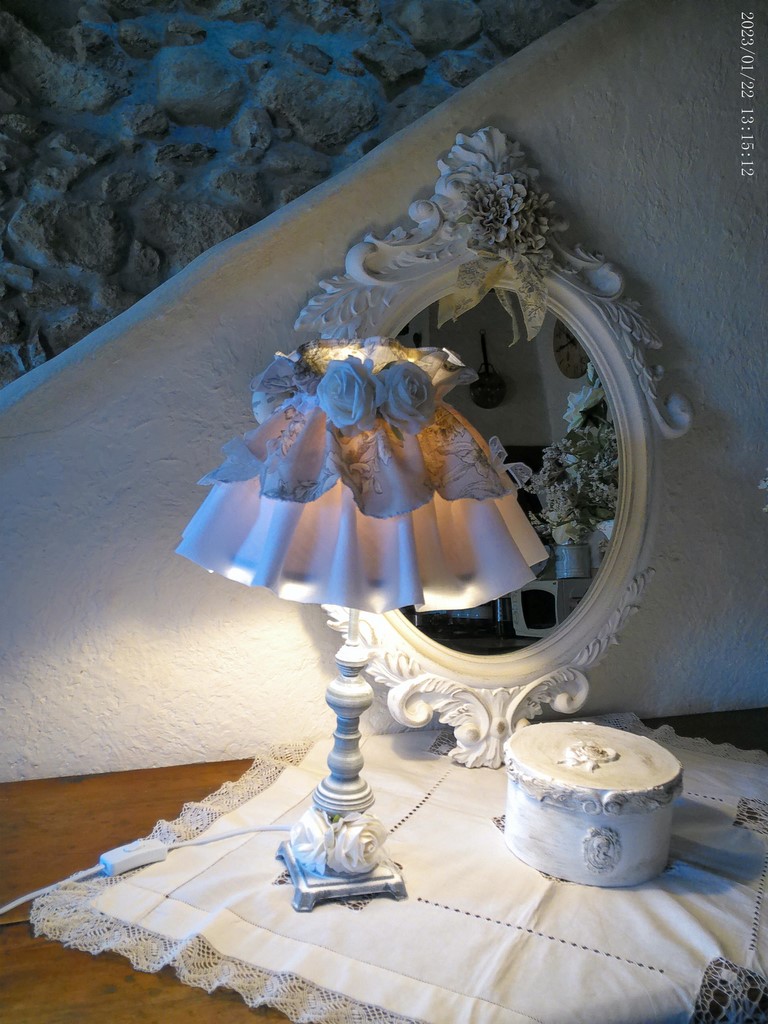 Petit rappel de la déco du pied de lampe, quatre petits noeuds en dentelle très fine blanche, et deux magnifiques boutons de roses.