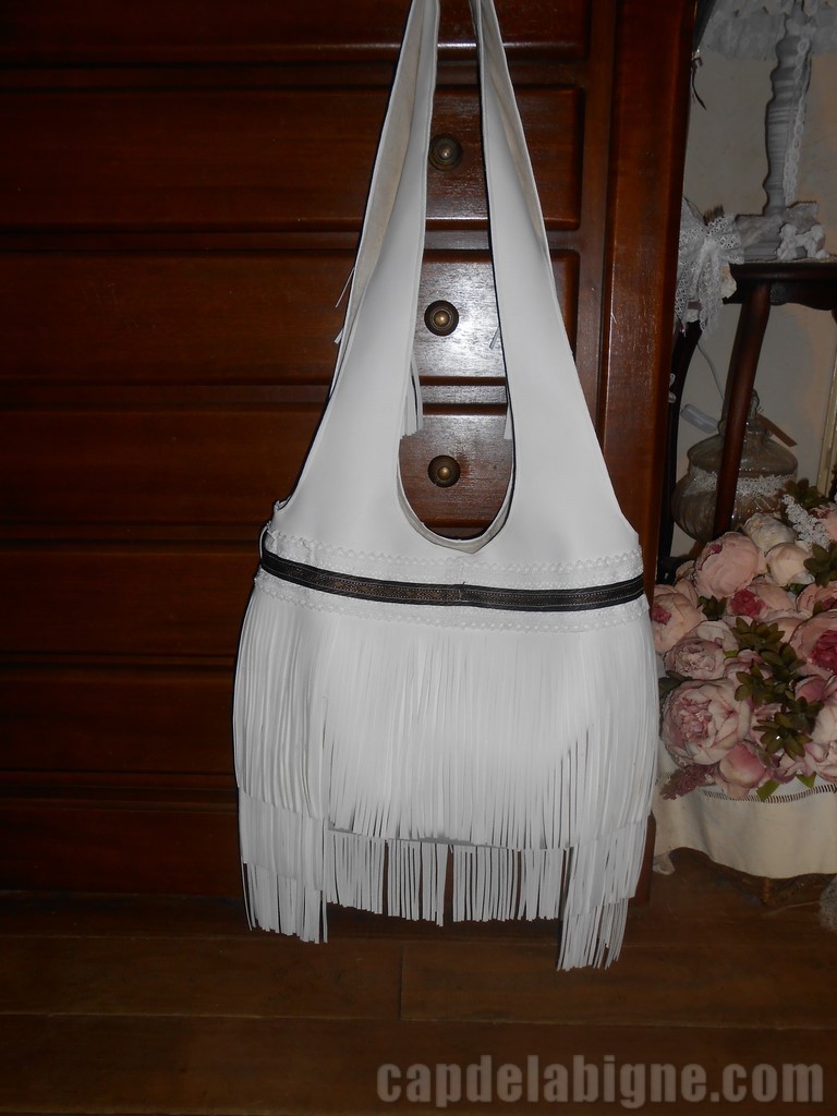 152 perles de différentes formes, matières et couleurs, de la dentelle de coton blanc, du galon indien, des feuilles brodées blanches, des breloques boho aux perles bleus, des franges et des pompons en lanières de croûtes de cuir, confèrent à ce sac Gypsy, tout son côté Bohème Chic.