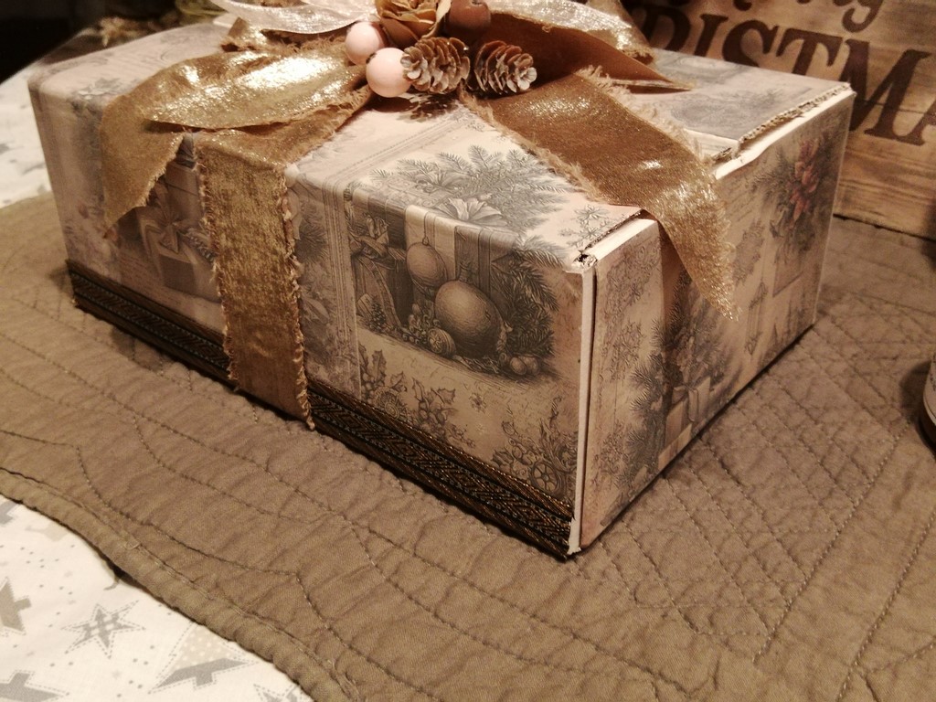 Un galon thème de Noël, un gros noeud fait de 3 noeuds successifs et un piquet de Noël, finissent la déco.